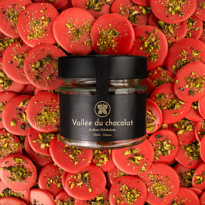 Zudem zwei frühlingshafte Valée Sorten: Yuzu-Schokolade - Sesam- Kornblume und Erdbeer Valées getoppt mit Pfeffer und Pistazien. Abgerundet wird das Paket mit unserem Zitrusfalter einer Yuzu-Bergamotten Marmelade.